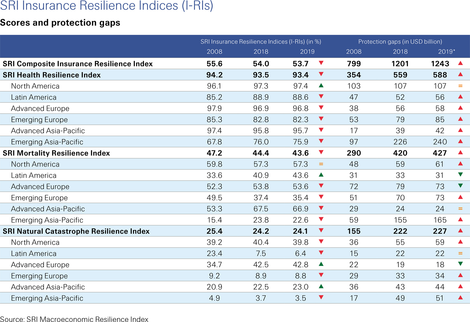 Insurance resilience weakened in 2019, the indices show, pushing the combined insurance protection gap for mortality, health and natural disaster risks to a new high. The global insurance protection gap for health, mortality and natural catastrophe risks reached USD 1.24 trillion in 2019, with health and mortality exposures accounting for more than 80% of the total.