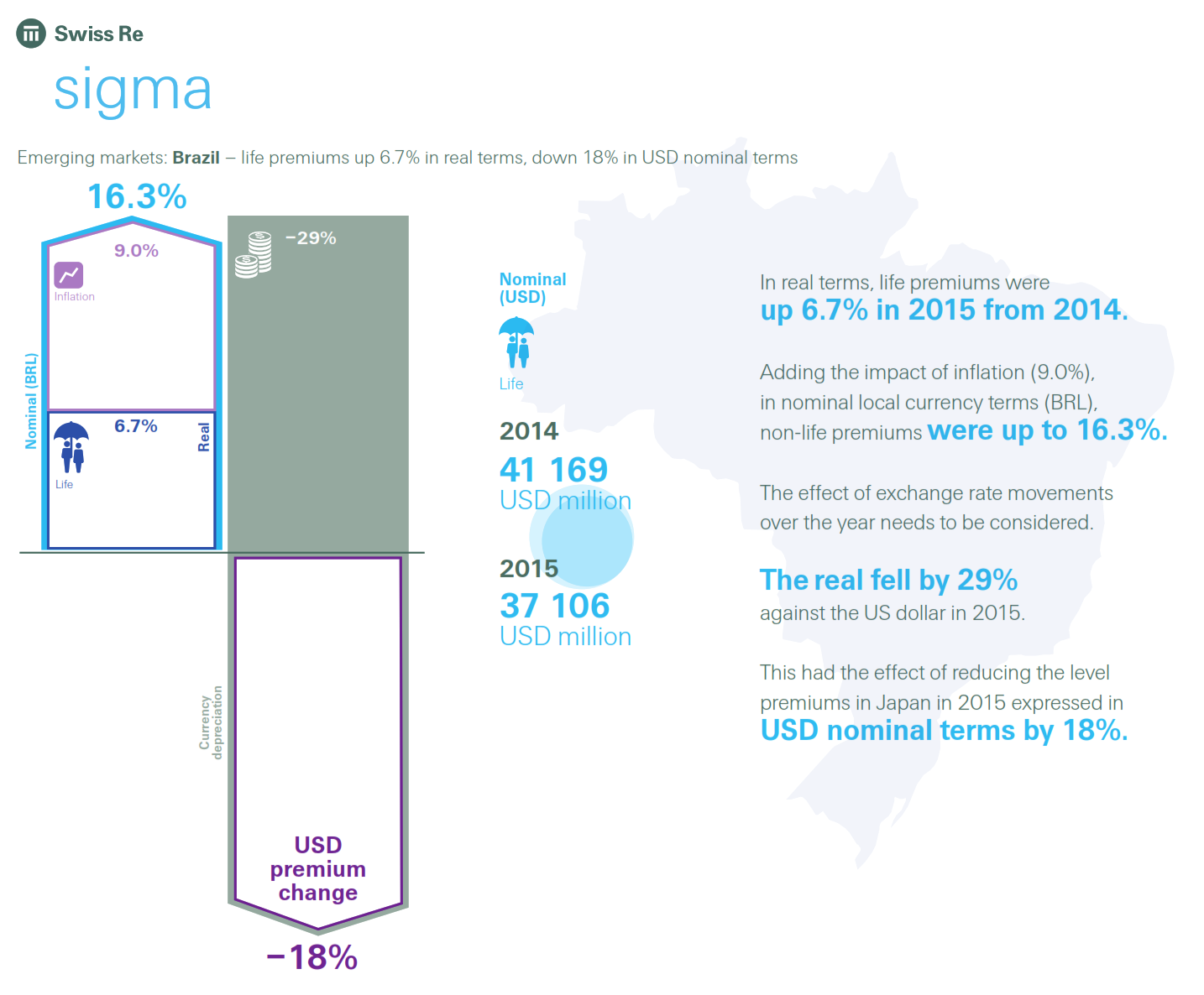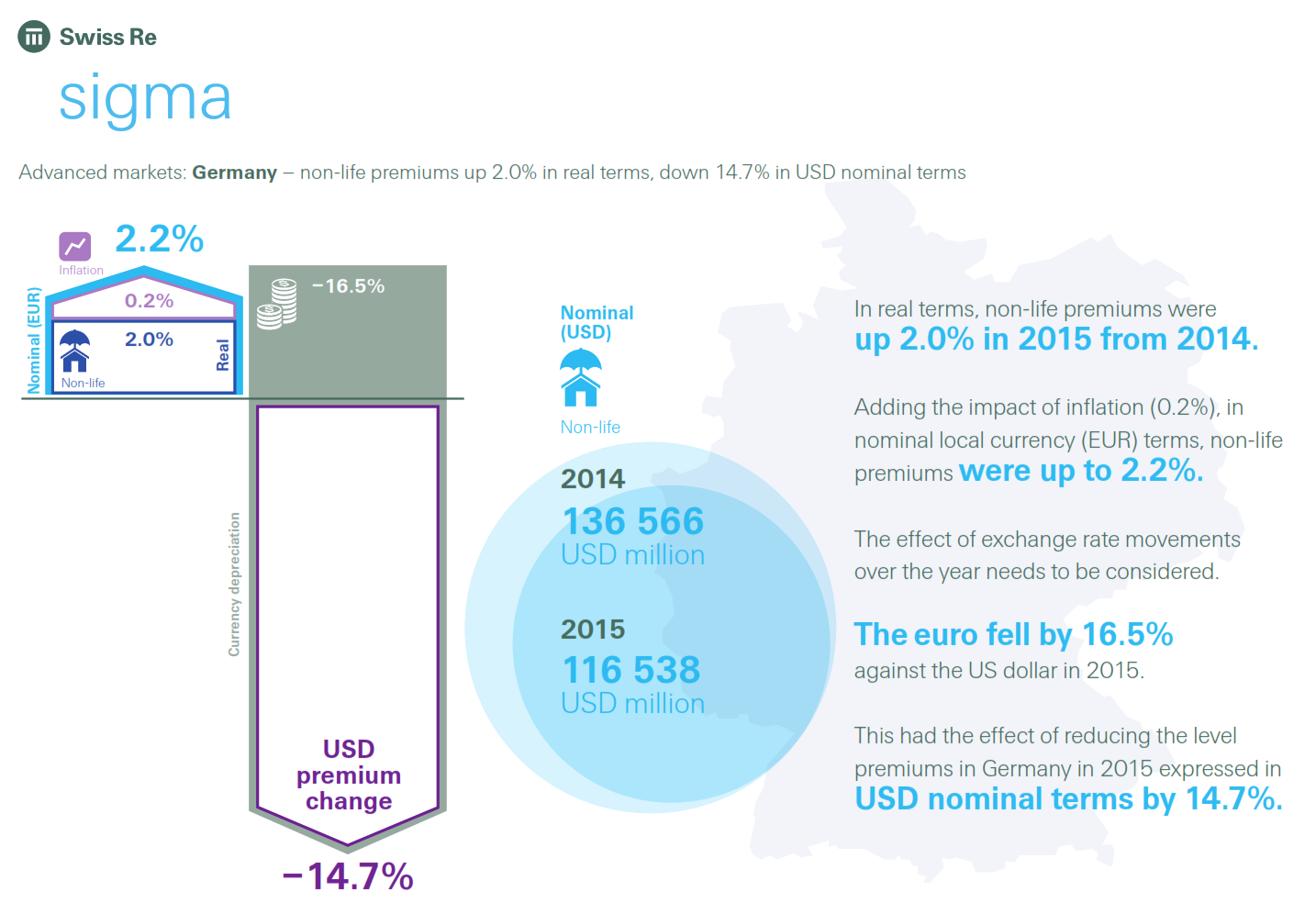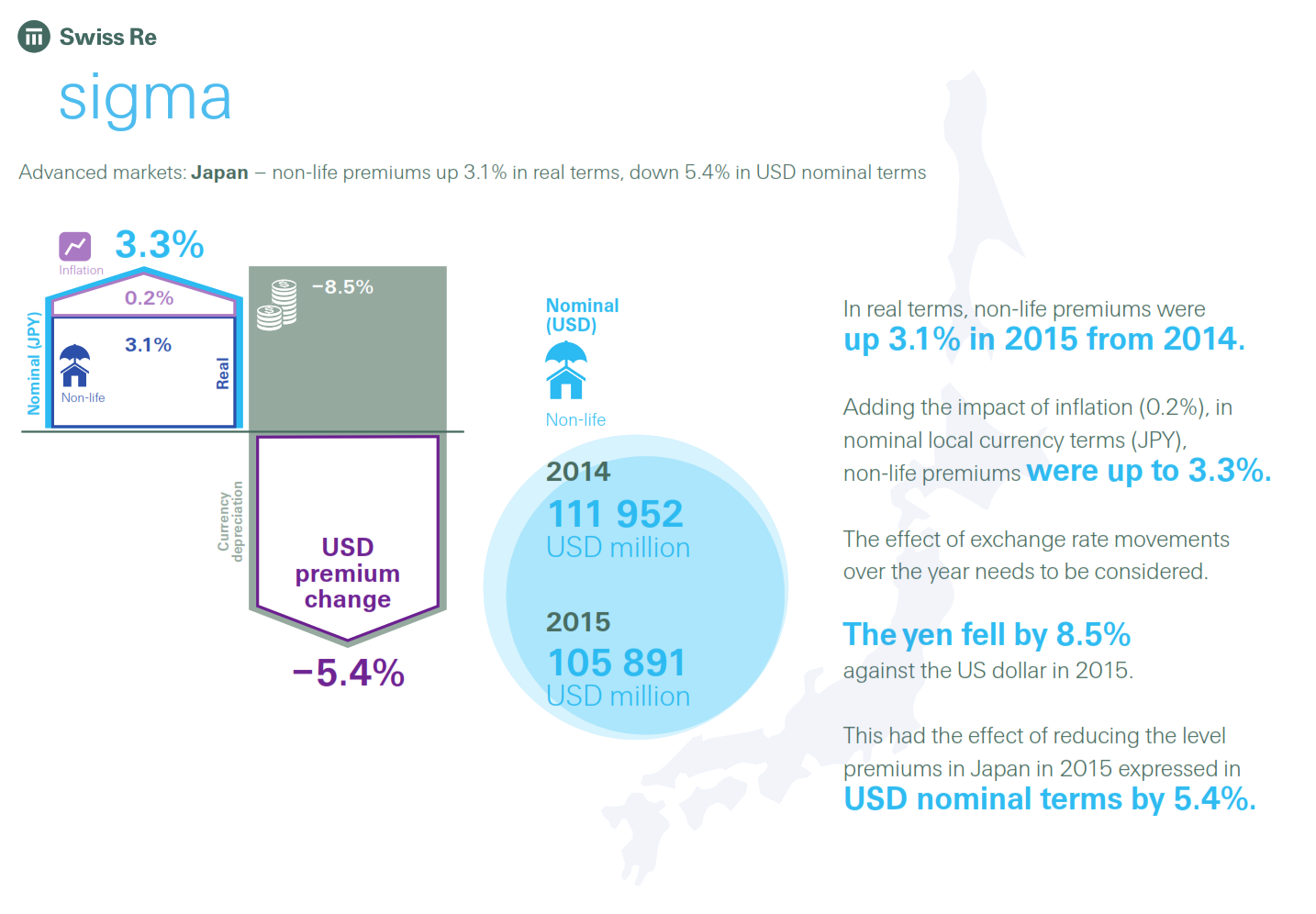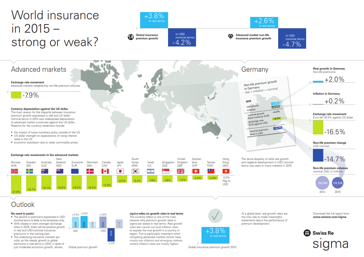 In spite of a challenging environment in 2015 with moderate global economic growth of 2.5%, direct premiums written grew 3.8% in real terms, up from 3.5% growth in 2014. However, in nominal US dollar (USD) terms, global premiums were down by 4.2%, due to currency depreciation against the USD, particularly in the advanced markets.