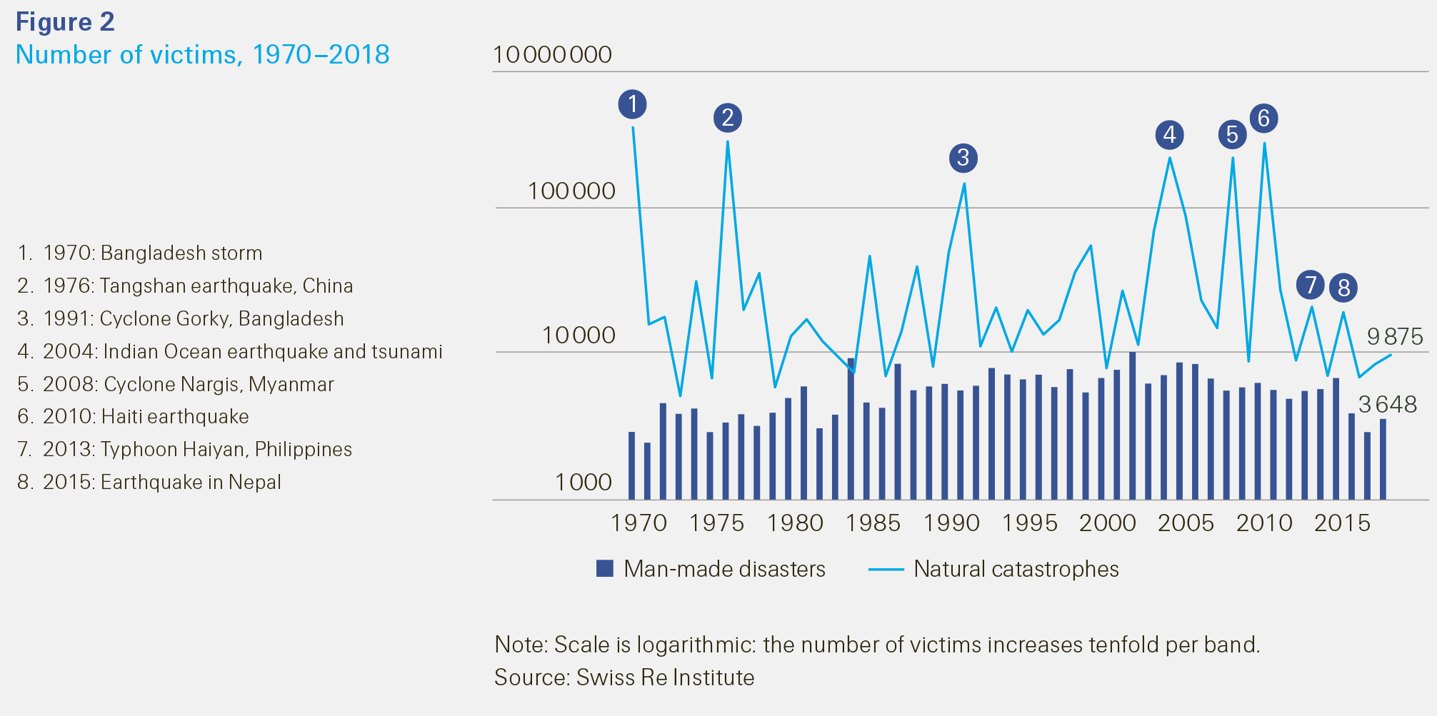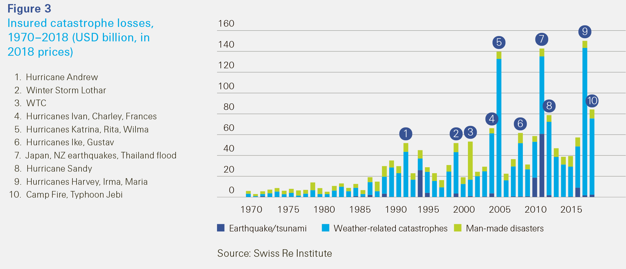 Global insured losses from natural catastrophe events in 2018 were USD 76 billion, the fourth highest on sigma records. More than 60% resulted from so-called "secondary" perils. The combined insurance losses from natural disasters in 2017 and 2018, meanwhile, were USD 219 billion, the highest-ever for a two-year period. Here too, more than half of the losses were due to secondary perils.
