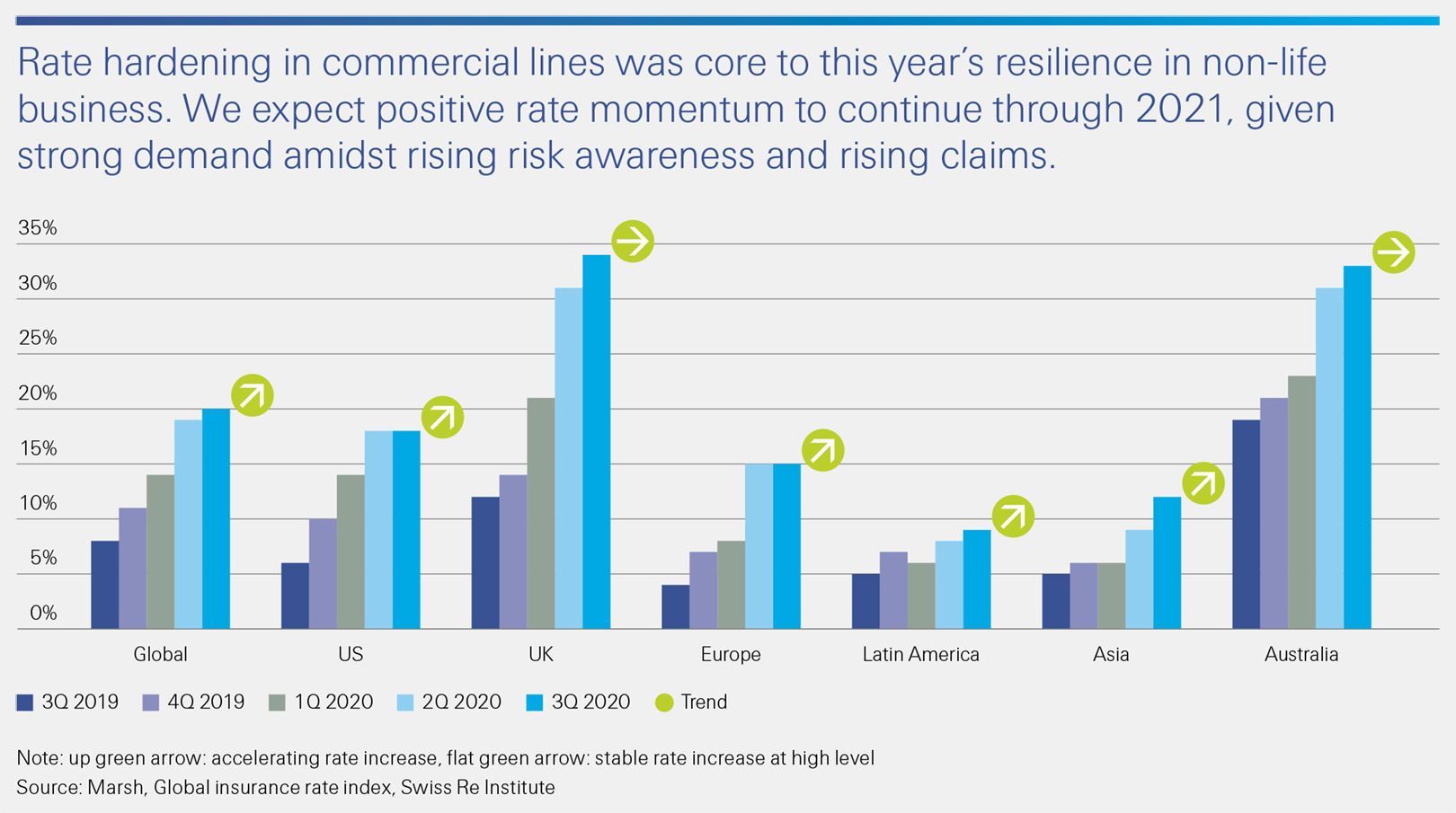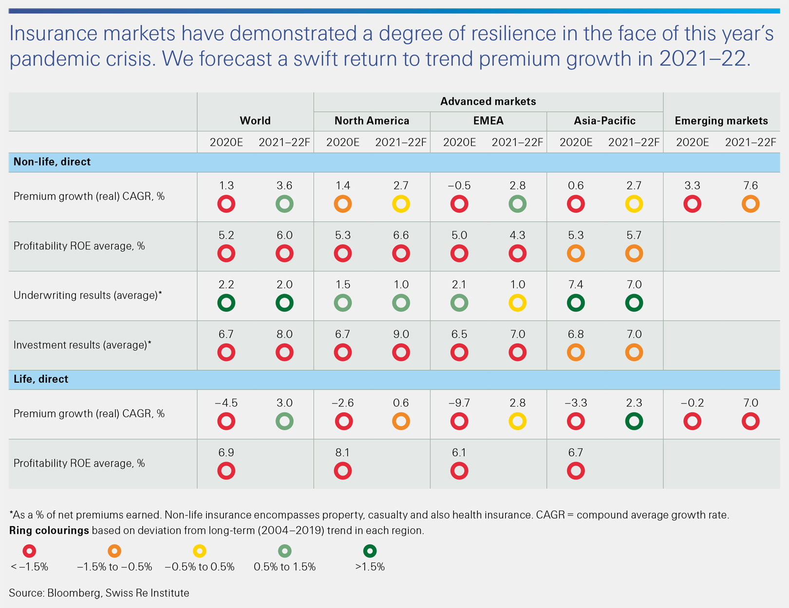 We now project global non-life premium growth will remain positive at 1.1% in 2020. We see a rebound to 3.6% growth in 2021 and 2022, with continued rate hardening momentum, particularly in commercial lines, underpinning the recovery. We forecast that global life premium volumes will still contract by 4.5% this year, but also recover strongly to annual 3% trend growth over the next two years.
