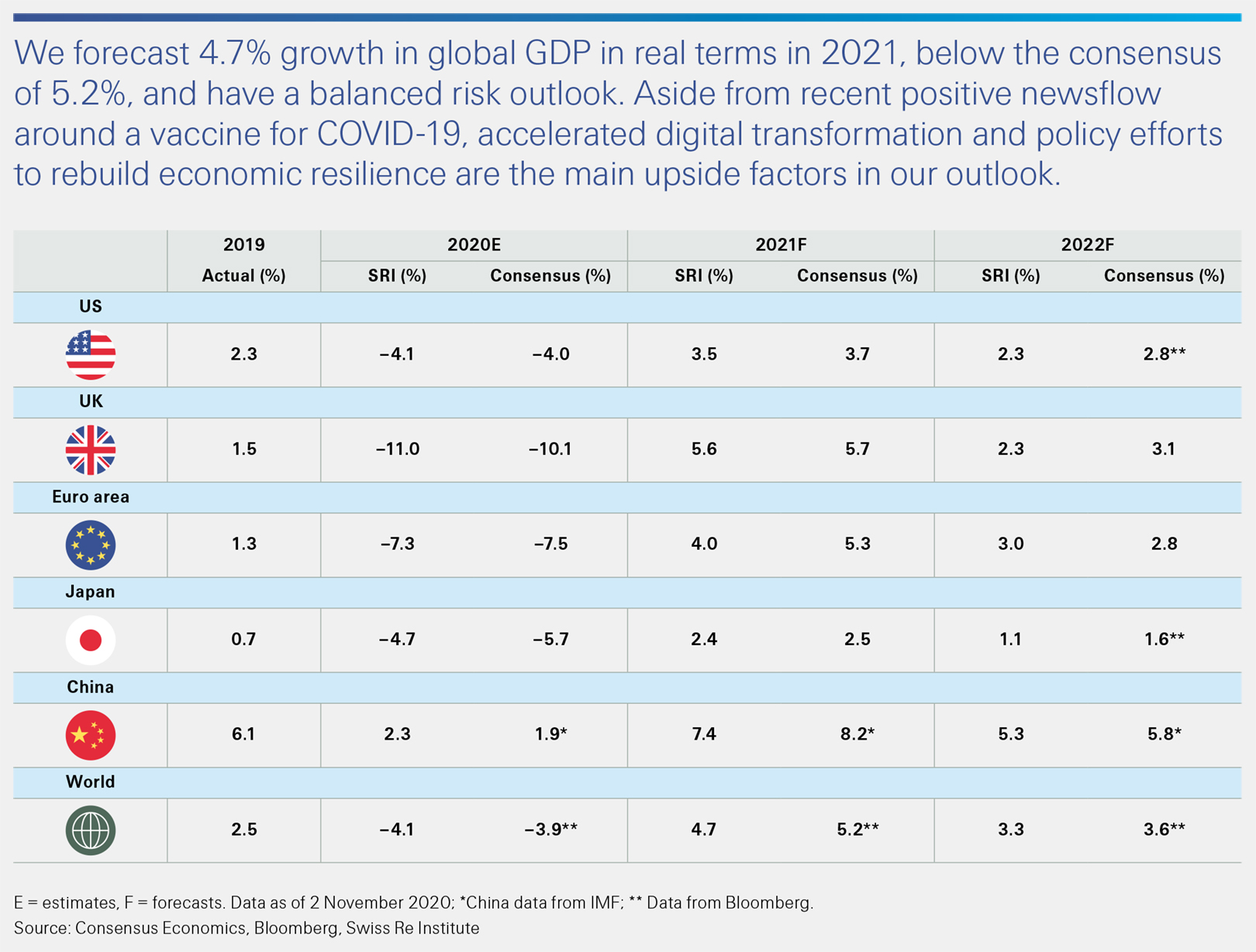 The world economy is experiencing the deepest recession of our lifetimes, but positive news about a potential COVID-19 vaccine means the risks to the outlook are now balanced. Still, reflecting the world's weaker economic resilience, we forecast a 4.1% contraction this year, with a recovery to 4.7% global growth in 2021 (below market consensus of 5.2%).