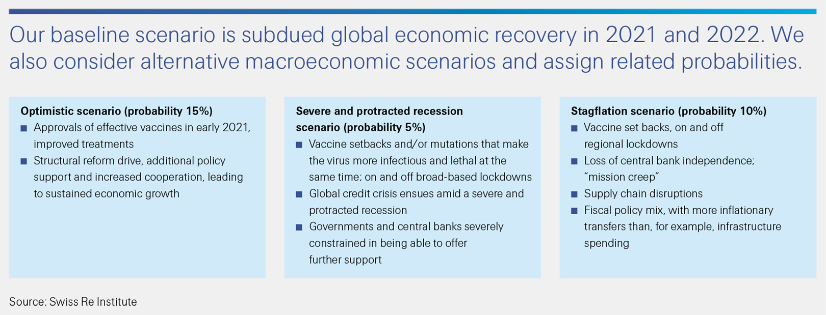 The economic and insurance outlook contains significant uncertainty, making scenario thinking essential. We consider three alternative scenarios from our core forecast: two more pessimistic and one more positive.