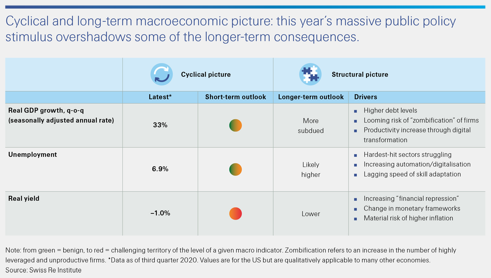 COVID-19 has accelerated several paradigm shifts already in the making, including digital transformation, de-globalisation and a larger role for governments in the economy. We also expect structural shifts such as lower potential growth, lower real yields, and a widening rift between financial markets and the real economy.