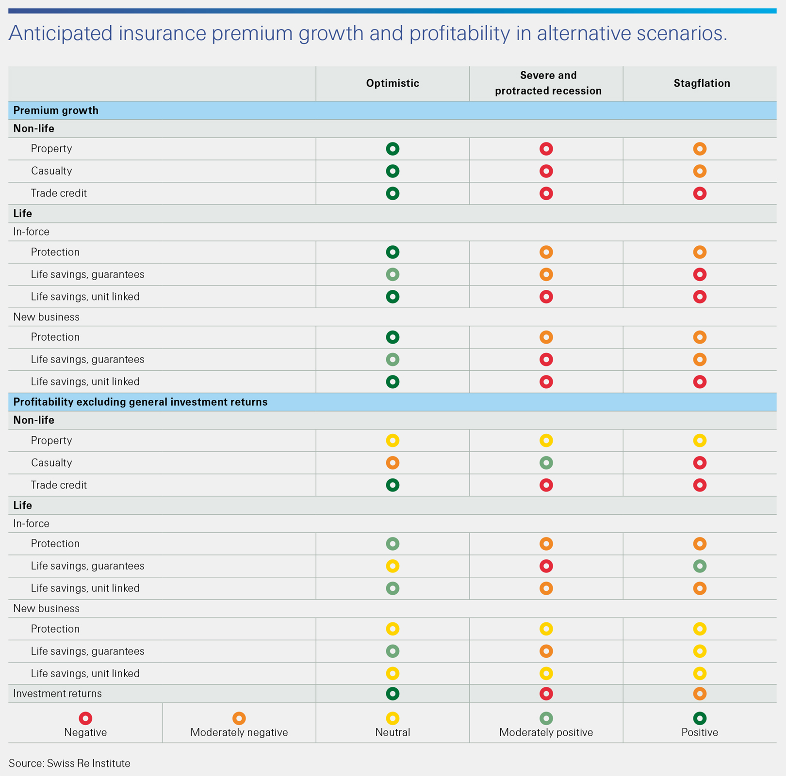 Our analysis indicates that the European insurance market may be particularly at risk from interest rate sensitivity in a severe recession scenario. In a stagflation scenario, inflation surprises could disrupt insurers with long-tail business, for instance in the US casualty market. In China, insurance market growth will be more exposed to GDP elasticity than in the US and Europe under all scenarios.